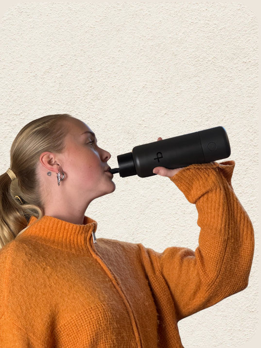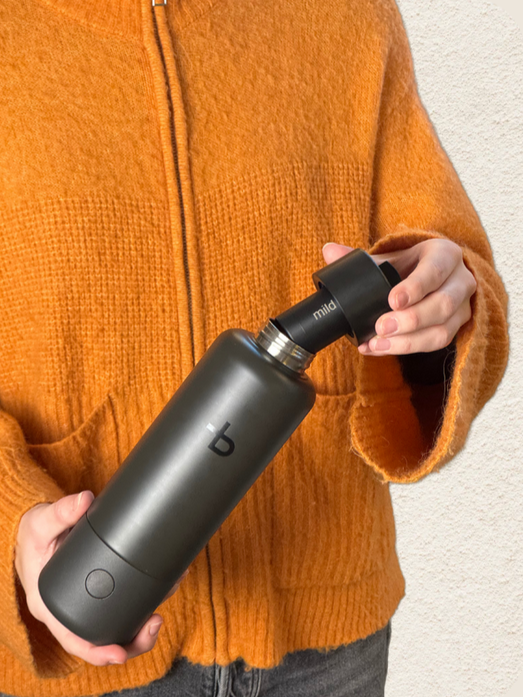 4. Falls du Sprudelwasser willst, das Wasser per Knopfdruck mit dem aufgesetzten taste Deckel sprudeln